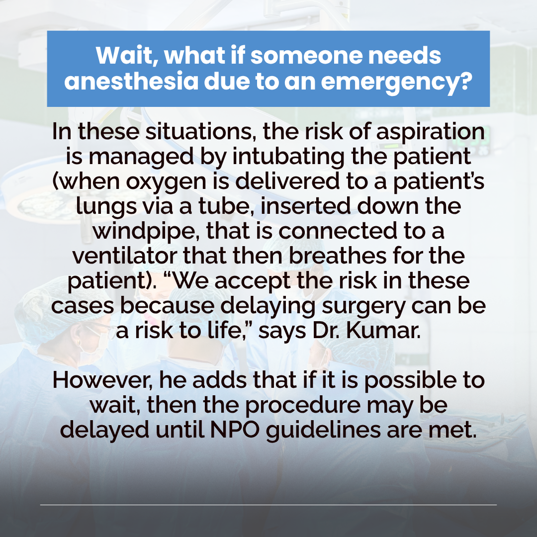 While aspiration is rare, it can be life-threatening. Because of this, if you eat or drink before your elective procedure, “Your surgery will be cancelled or delayed until NPO guidelines are met,” says Dr. Kumar, adding that your procedure may be cancelled, “Even if you have waited months for surgery.” This may cause further delays, as your procedure will have to be rebooked by the surgeon in their next available slot.