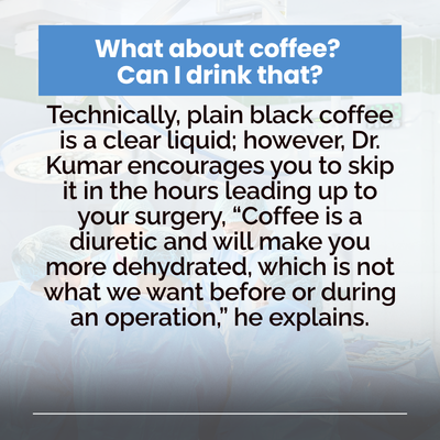 We know that following NPO guidelines can be challenging, and that it’s tempting to find a hack to deal with them. However, Dr. Kumar explains that in the days leading up to your procedure, it’s best to follow your normal diet and routine. While it might seem like a good idea to eat extra the day before your surgery, he discourages this approach, “Sometimes eating an extra-large meal can make you feel even hungrier the next day.”