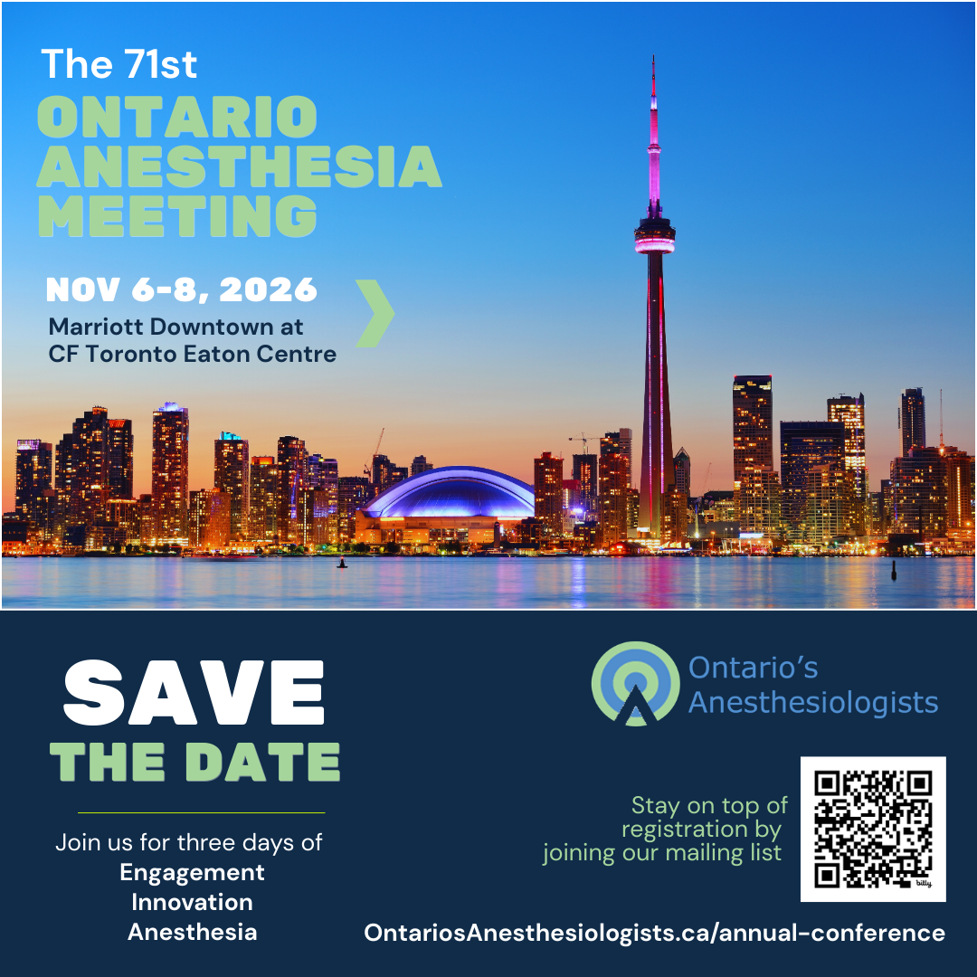 Mark your calendars to join Ontario’s Anesthesiologists at the 71st Annual Ontario Anesthesia Meeting from November 6th to 8th, 2026, at the Marriott Downtown at CF Toronto Eaton Centre in Toronto, Ontario! Offering an exceptional academic program filled with engaging presentations and meaningful professional connections, the Ontario Anesthesia Meeting continues to be one of Canada’s largest and most impactful gatherings dedicated to anesthesia. Please watch our website for event updates and join our email list to be notified when registration opens.