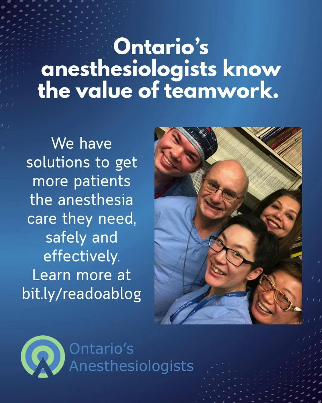 Ontario’s Anesthesiologists represents the province’s over 1,500 practicing anesthesiologists. We are dedicated to advocating for our members, the physicians who see patients through some of the most critical times in their lives. We are a Section of the Ontario Medical Association and are committed to delivering the highest standards of innovative, safe, and sustainable patient care. Learn more about us.